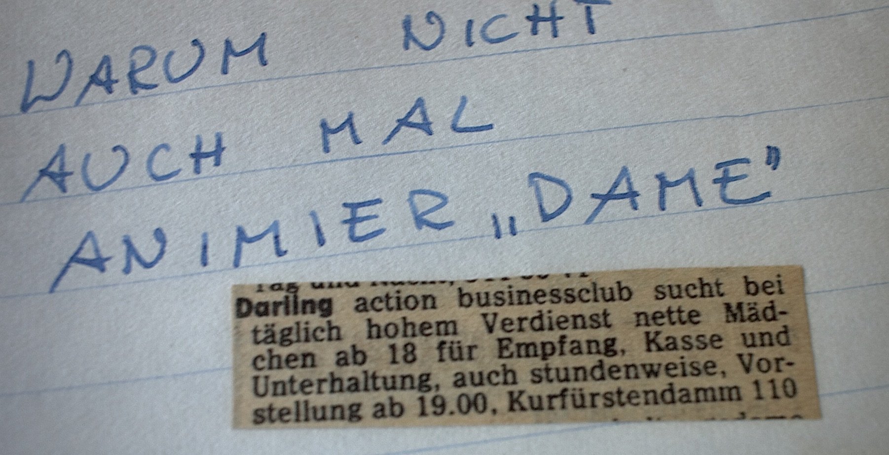 También trabajé en un cabaret: el desaparecido “Café Potsdam” en la Postdamerstraße. El local había sido previamente un bar de ambiente y habían preservado el mobiliario. En la sala trasera había una camilla ginecológica y en otra, una cama enorme con fundas de piel de tigre.