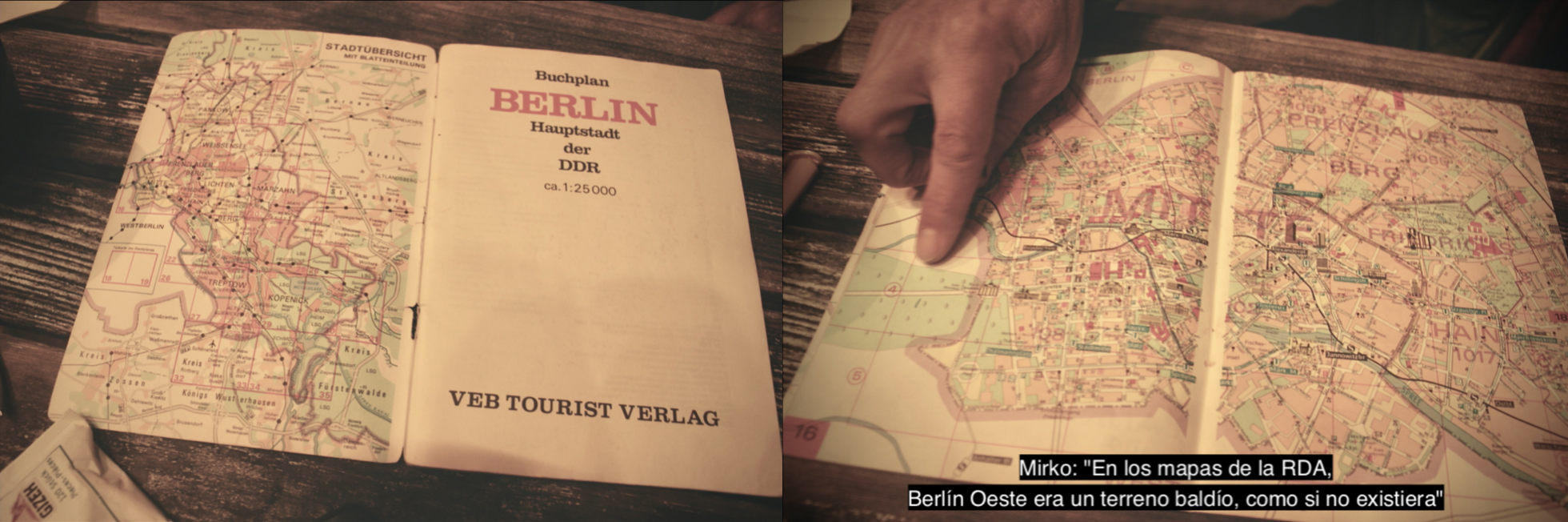 Cuando eres niño, no te haces preguntas existenciales. El muro, la división de los dos Berlines, estaba ahí, pero hasta que crecí nunca me atreví a preguntar. Mira (la imagen). Esta es una guía turística de Berlín Este de los años ochenta. En el mapa, Berlín Occidental era un terreno baldío, sin calles, blanco, como si no existiera. Era una "ciudad fantasma".